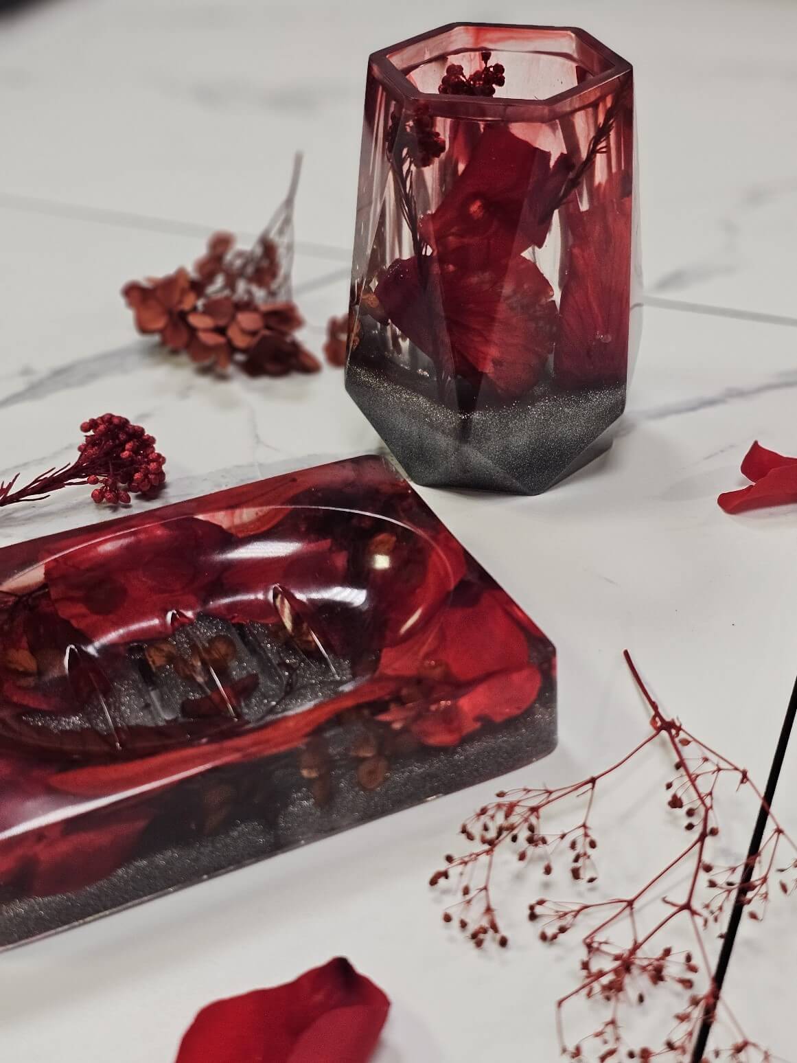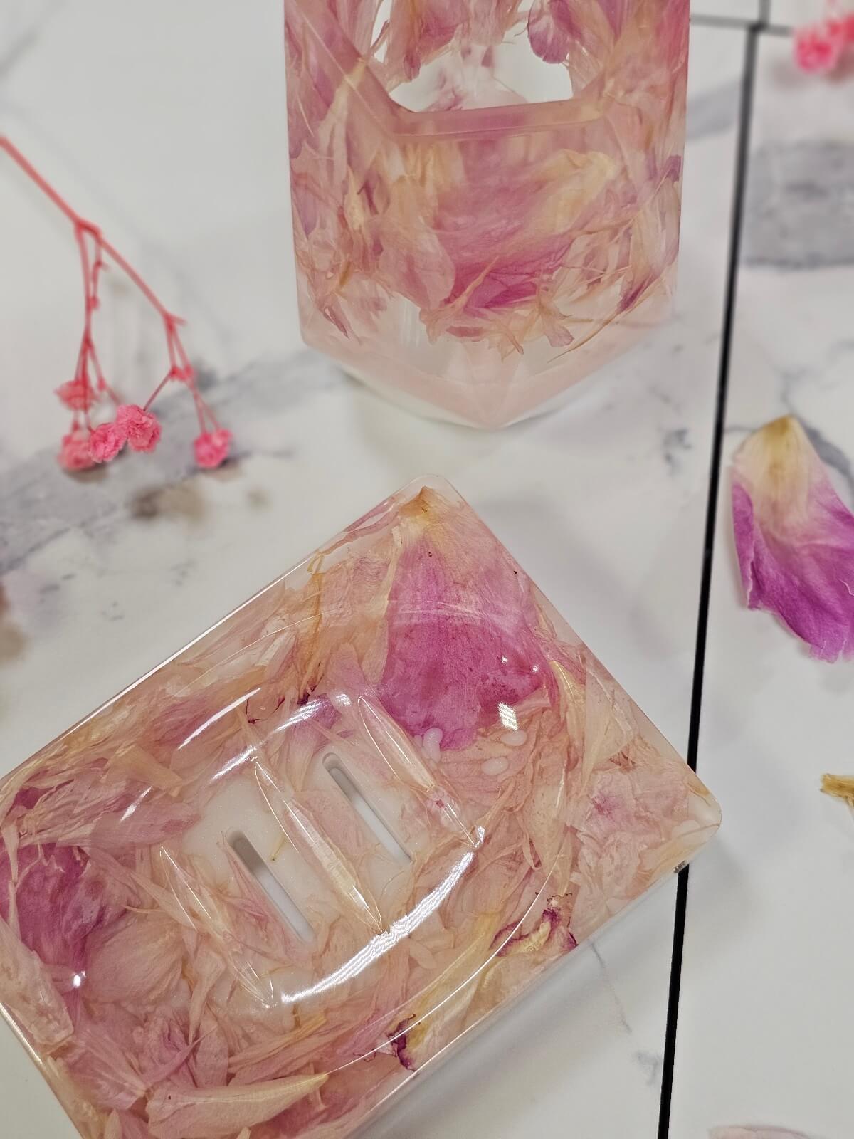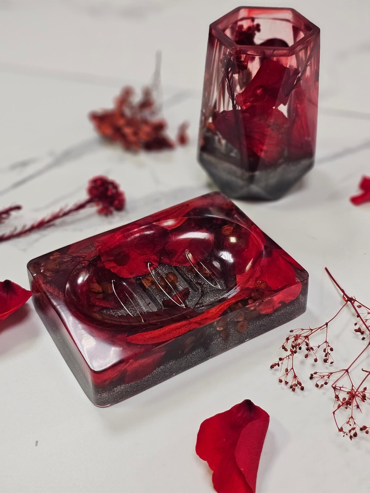 Эксклюзивный комплект, созданный для тех, кто ценит красоту в деталях. Мыльница и стакан для зубных щёток из эпоксидной смолы с натуральными листьями пиона станут изюминкой вашего интерьера.