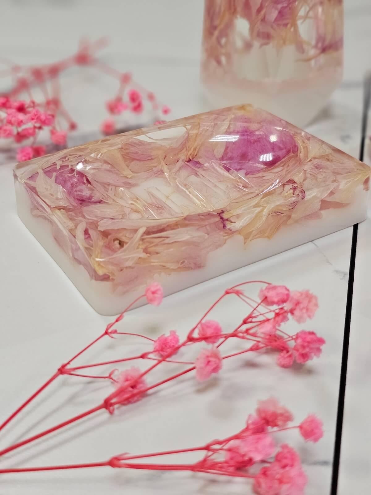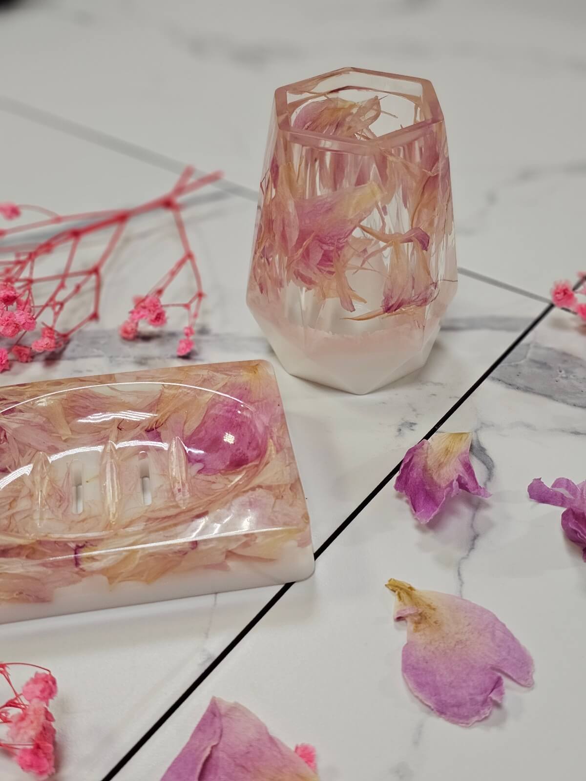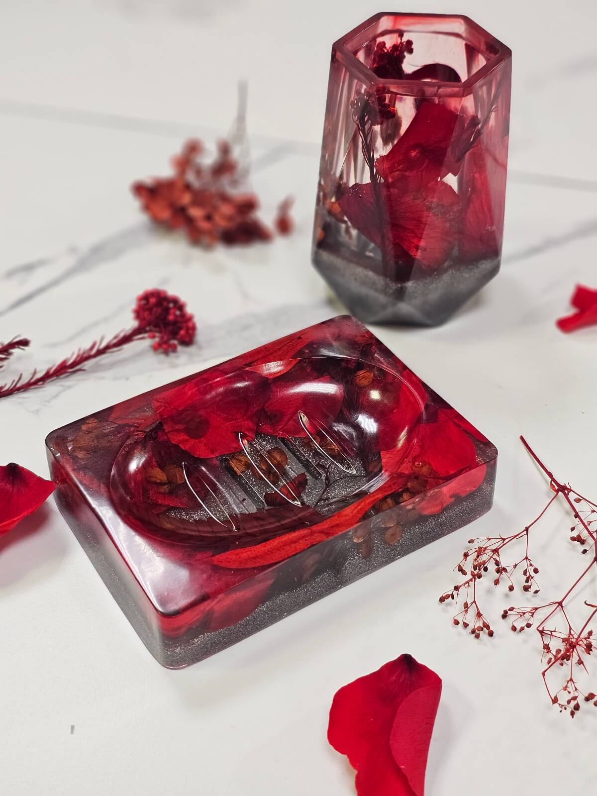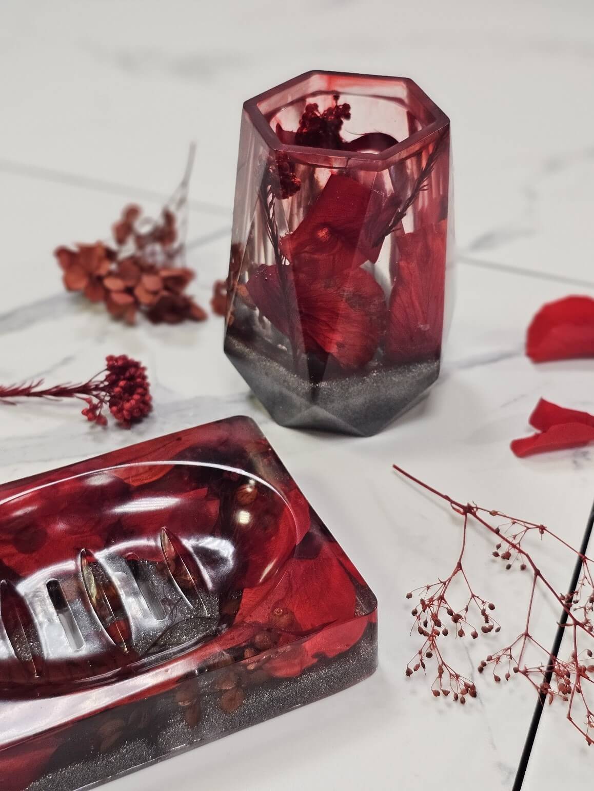 Эксклюзивный комплект, созданный для тех, кто ценит красоту в деталях. Мыльница и стакан для зубных щёток из эпоксидной смолы с натуральными листьями пиона станут изюминкой вашего интерьера.