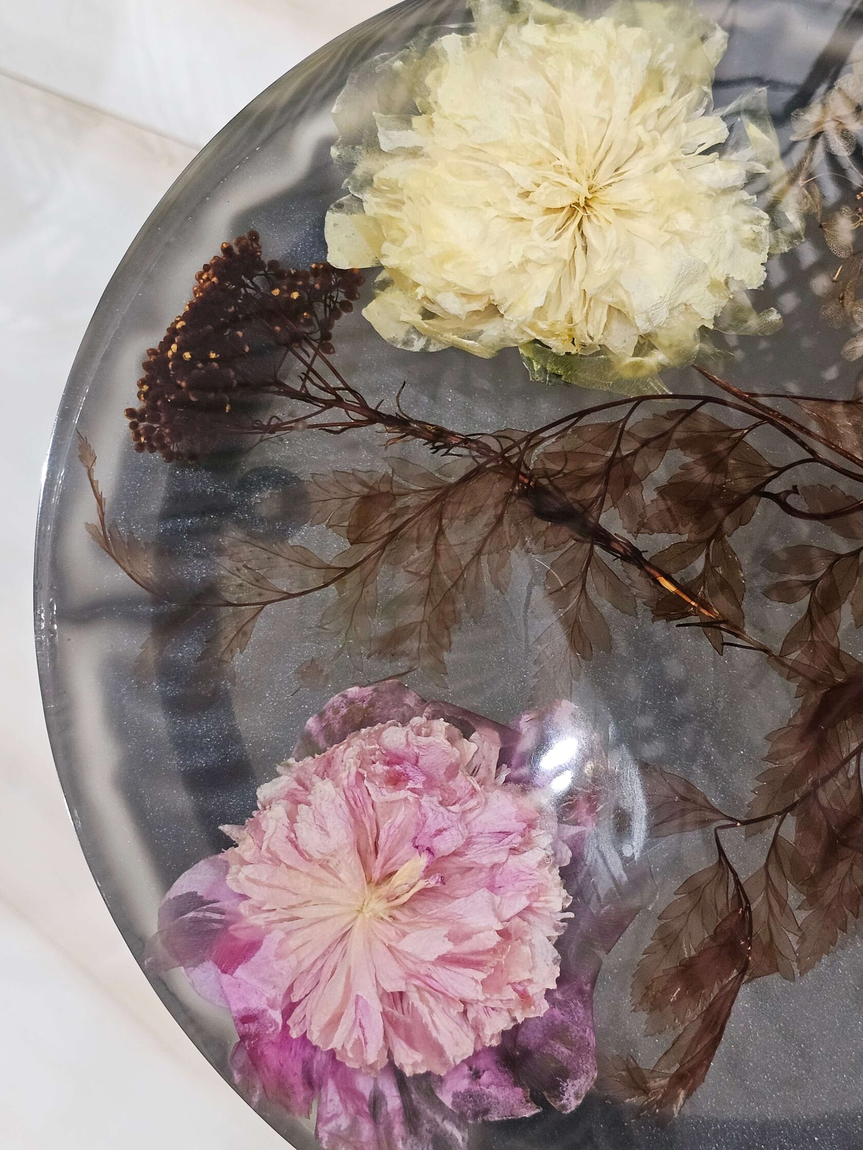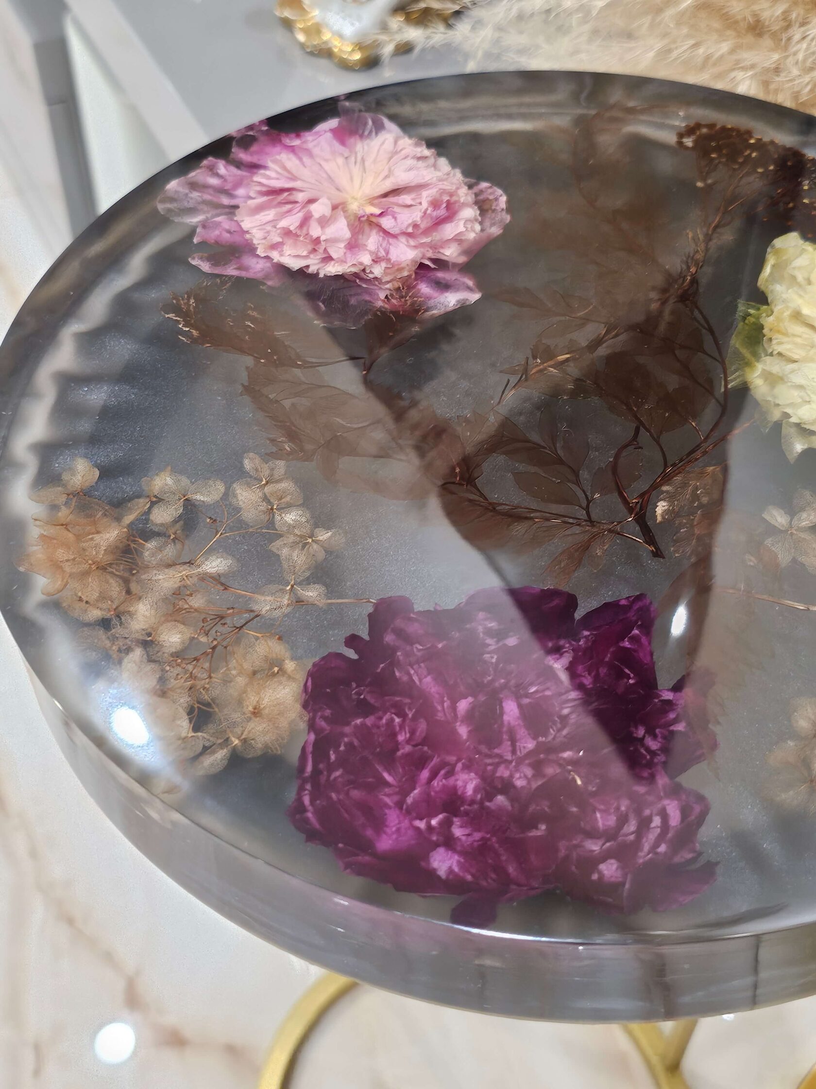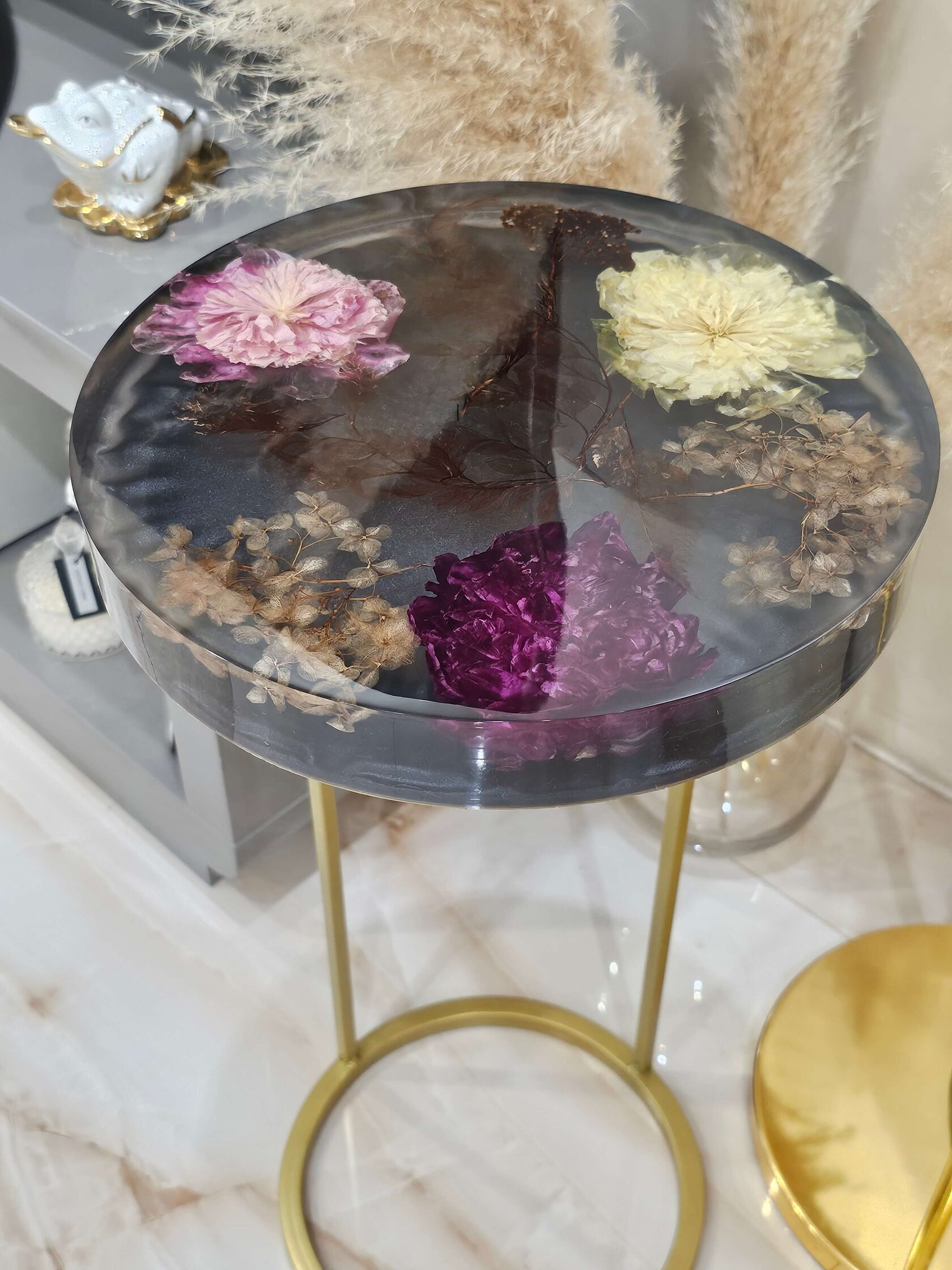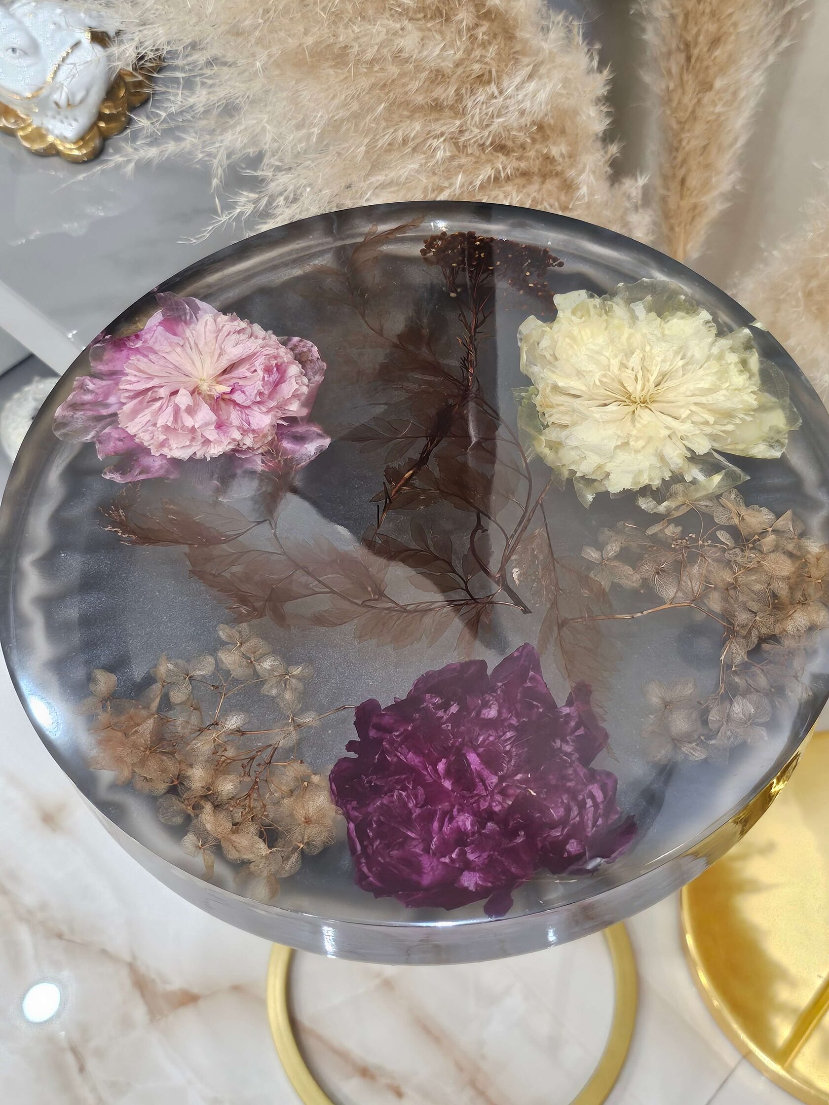 · Диаметр столешницы: 30 см. · Толщина столешницы: 5 см (солидный и дорогой вид). · Общая высота: 62 см (идеальная для кофейного столика). · Материалы: эпоксидная смола высочайшего качества, натуральные цветы пионов, надежное подстолье.