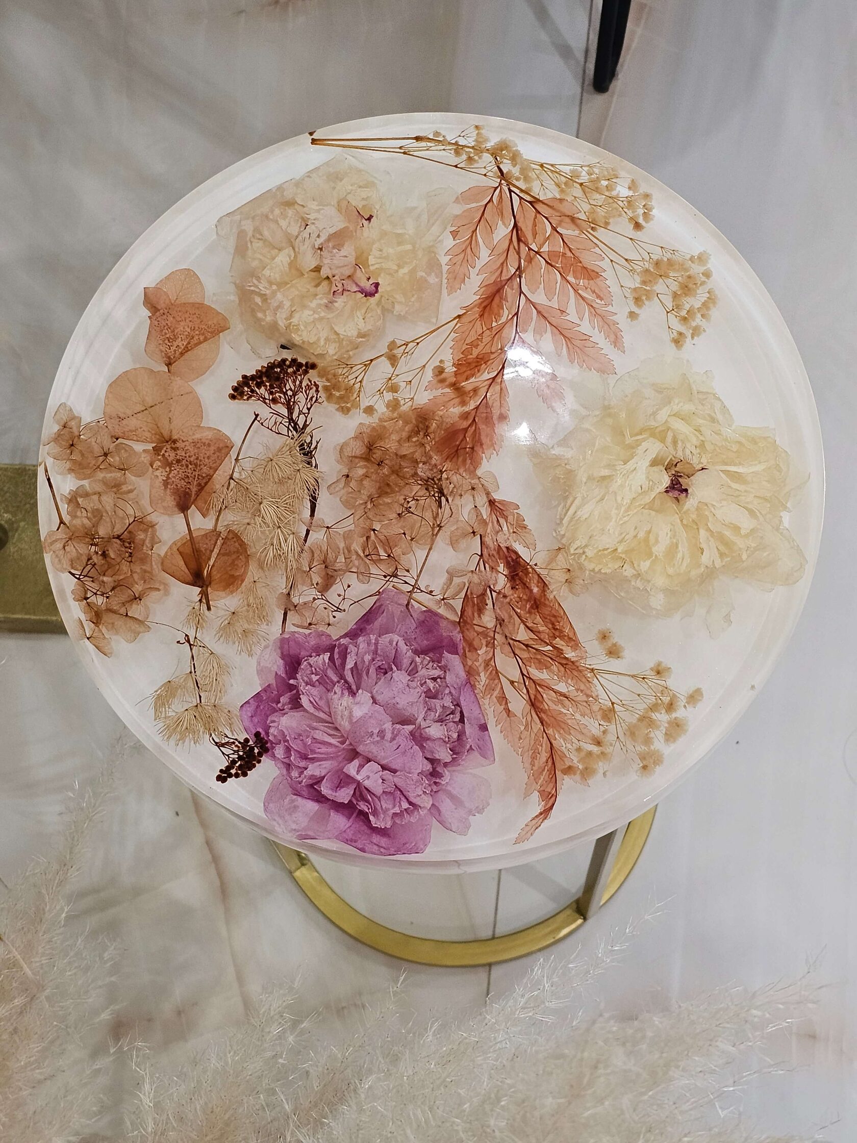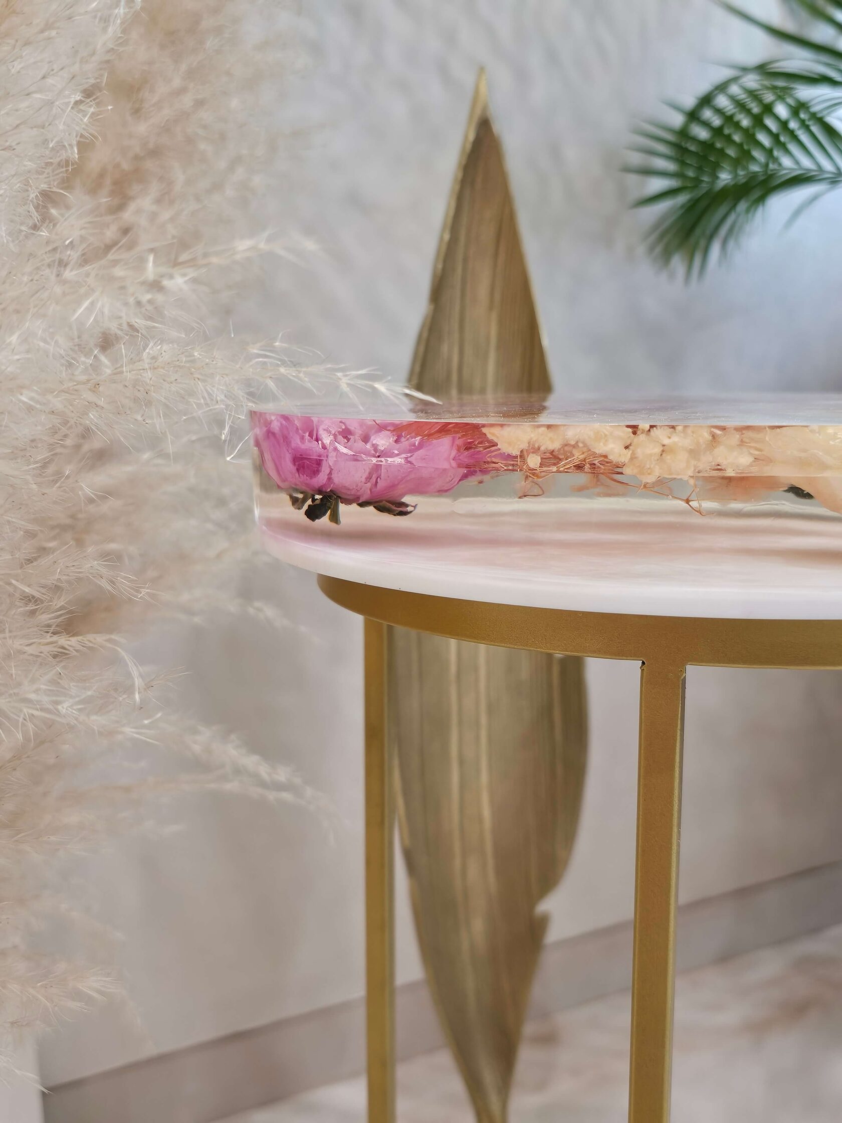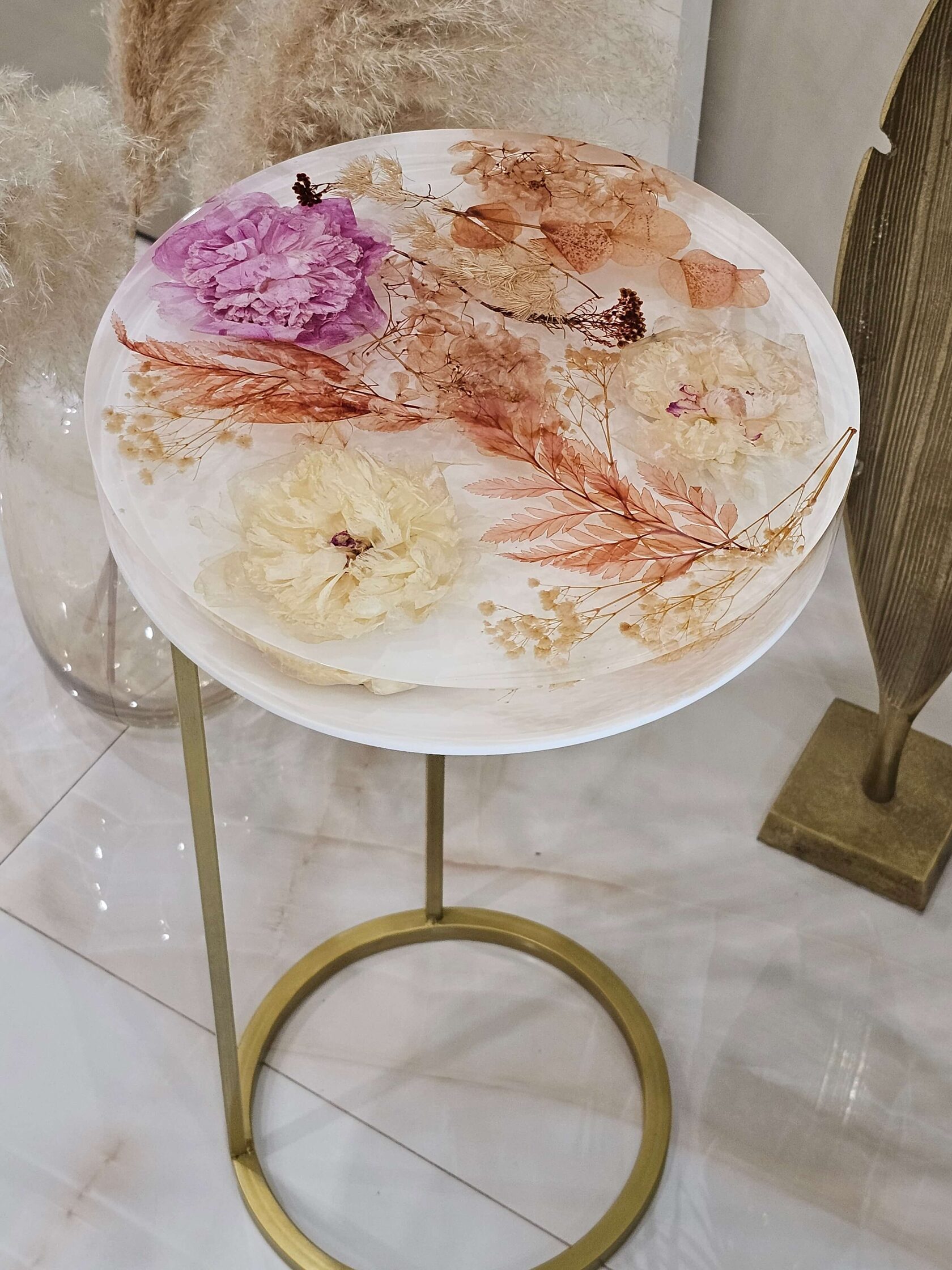 · Диаметр столешницы: 30 см. · Толщина столешницы: 5 см (солидный и дорогой вид). · Общая высота: 62 см (идеальная для кофейного столика). · Материалы: эпоксидная смола высочайшего качества, натуральные цветы пионов, надежное подстолье.