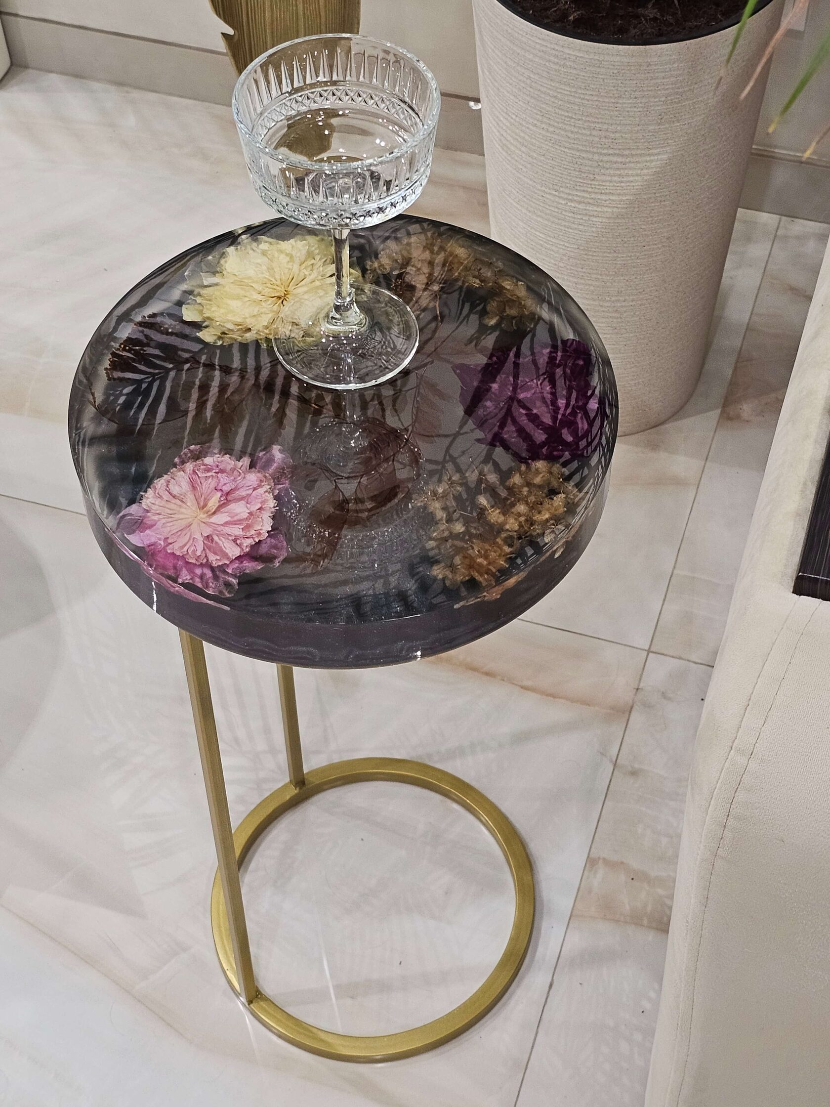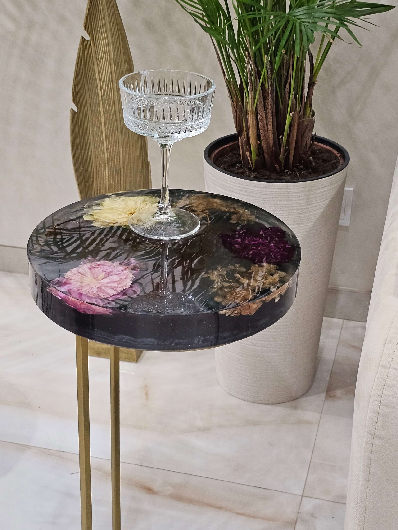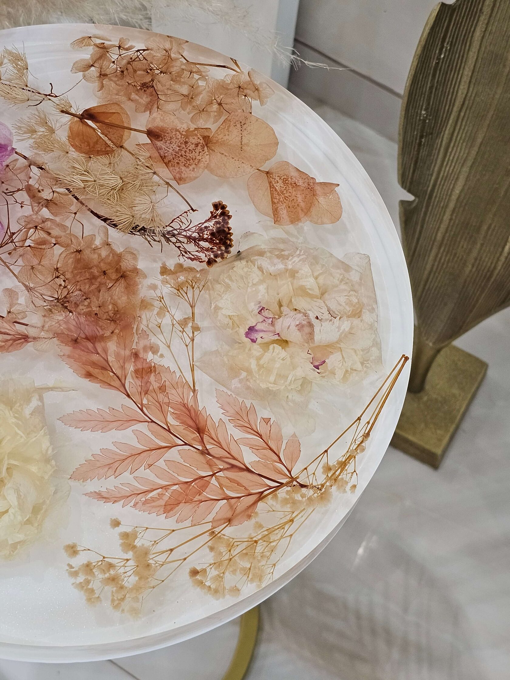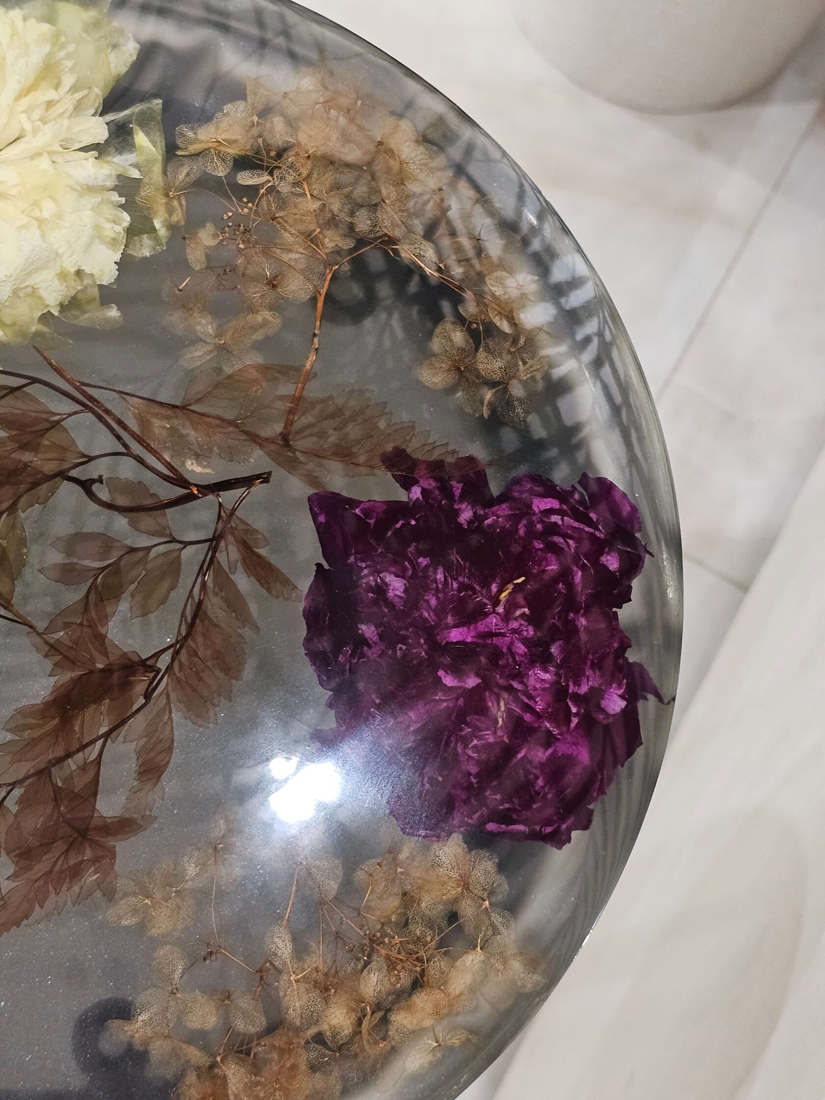 · Диаметр столешницы: 30 см. · Толщина столешницы: 5 см (солидный и дорогой вид). · Общая высота: 62 см (идеальная для кофейного столика). · Материалы: эпоксидная смола высочайшего качества, натуральные цветы пионов, надежное подстолье.
